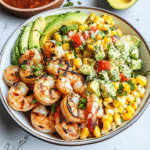 Enjoy a vibrant Grilled Shrimp Bowl featuring succulent shrimp, zesty avocado corn salsa, and a rich creamy garlic sauce—perfect for summer gatherings and quick weeknight dinners!