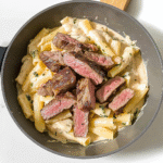 - Return the seared steak to the skillet along with cooked pasta. Toss everything together, adding reserved pasta water as needed for desired creaminess.