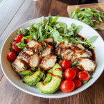 4. Layer It Up: On a serving platter, layer sliced grilled chicken, followed by mozzarella balls, avocado slices, and halved cherry tomatoes.