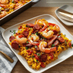 In conclusion, this Sheet Pan Shrimp & Chorizo Paella-Style Bake offers a delightful twist on traditional paella that’s both easy to prepare and delicious. With minimal cleanup thanks to one-pan cooking, you can enjoy rich flavors from shrimp and chorizo combined with aromatic spices and vegetables. Whether it’s a weeknight dinner or a special occasion, this dish will impress everyone at your table while keeping things simple yet flavorful. Don’t hesitate to customize it with your favorite ingredients!
